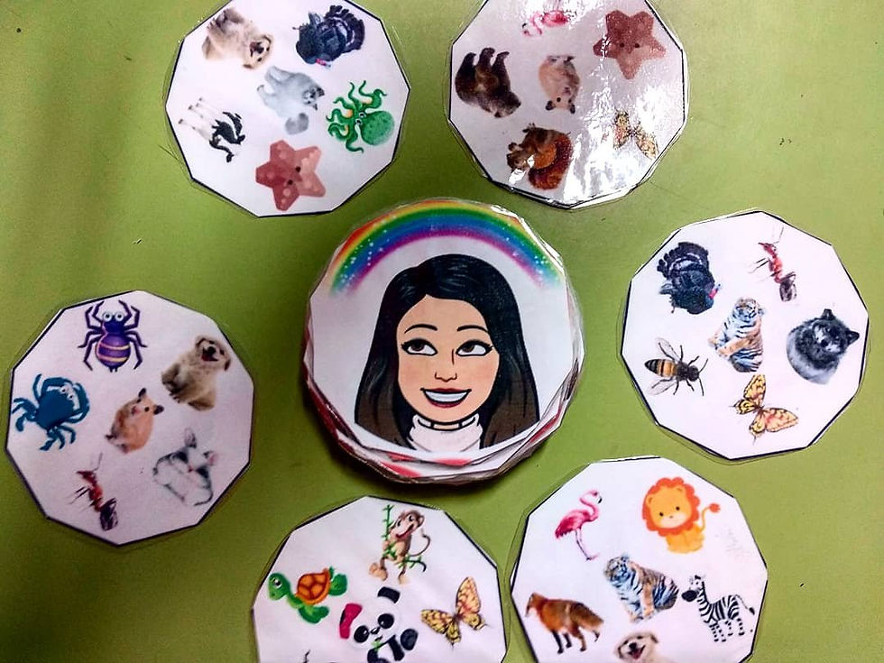 Each card in this game features six different animals. Any two cards have exactly one animal in common. For the basic Spot it! game, reveal one card, then another. Whoever spots the animal in common on both cards claims the first card, then another card is revealed for players to search, and so on.